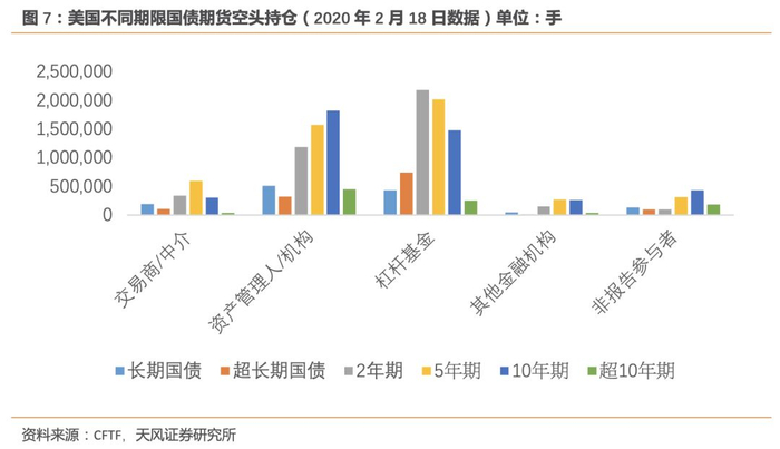 在以保险机构、养老基金等为主的资产管理人的持仓结构中,多头持仓是5年期、10年期、2年期的国债期货位列前三,分别占其总持仓量的31%、26%、20%;空头持仓的最高位为10年期,其次为5年期和2年期,分别占比31%、27%、20%。