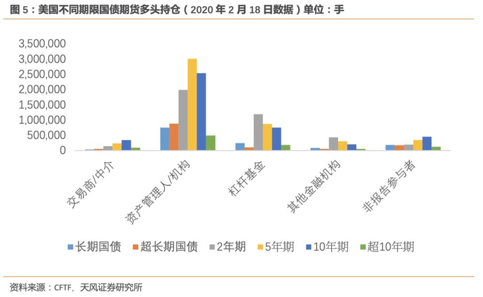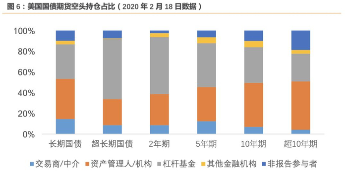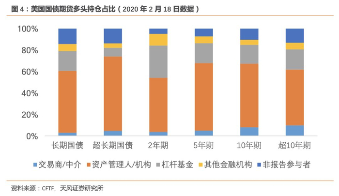 CFTF将国债期货的参与者主体划分为四类:交易商和中介、资产管理人和机构、杠杆基金和其他金融机构。其中,资产管理人和机构主要包括保险机构、养老基金、捐赠基金、公募基金以及以机构为客户的资产管理者;杠杆基金主要包括商品交易顾问(CTAs)以及商品基金经理(CPOs);交易商和中介主要是以商业银行和投资银行为主的大型银行机构以及中介;其他金融机构主要是指风险对冲机构,以财务公司、信用社以及中央银行等为主。