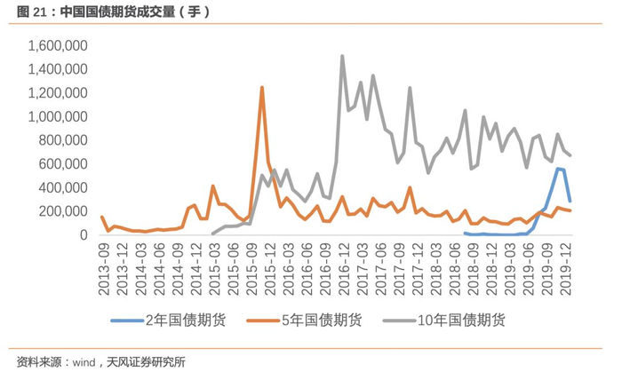 国债期货是当前我国仅有的、在场内市场有活跃成交的利率衍生品。自2013年我国国债期货市场重新开放发展至今,市场已有2年期(TS),5年期(TF)和10年期(T)三类覆盖短中长期国债期货的品种,10年期国债期货成交量与持仓量均为近几年最大的期货品种,截止2020年2月,持仓量达7.5万手,成交量自2019年以来基本大部分月份超过70万手。与美国相比,目前中国国债期货的日均成交量为美国的13%,国债期货市场持仓量为美国的4%。