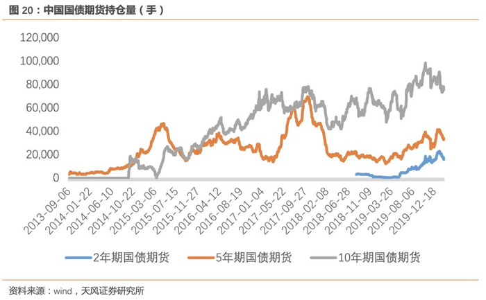 在国债期货市场中,主流的交易品种为10年期和5年期的国债期货产品。2019年10年期国债期货产品交易量最高,占总交易量的40%,其次为5年期产品(占比26%)。在持仓量上,近几年5年期、10年期、2年期国债期货持仓量一直排名前三位,截止2020年2月18日,分别持仓477万手,428万手,396万手。