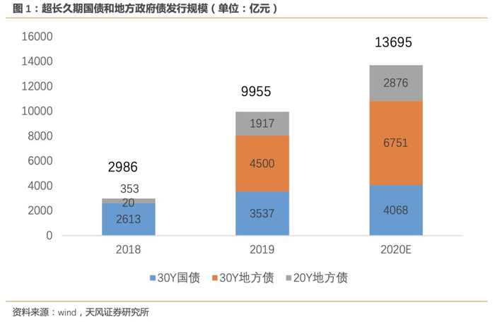 2019年以来,30年期地方债的发行量大幅上升,且趋势可持续。2018年超长期利率债(30年期国债+30年期地方债+20年期地方债)的发行量合计仅为2986亿元,但2019年的相应规模激增至9955亿元(其中地方债6418亿元)。我们预计2020年超长期地方债的发行规模将同比提升约50%,超长期国债的发行规模同比提升约15%,基于此测算我们判断2020年超长期利率债的发行规模将增至约13700亿元。