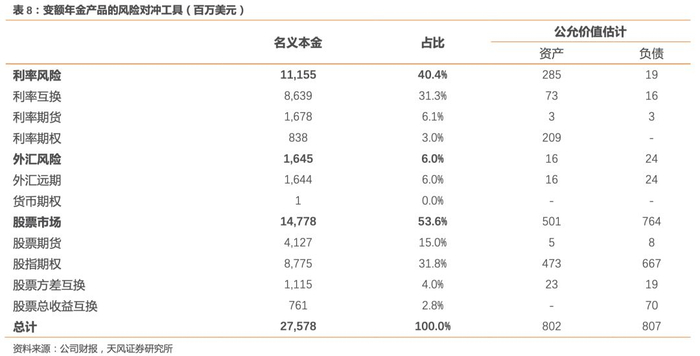 1)与保证利益有关的风险:公司使用一系列衍生工具合同来减轻与保单的保证生存利益保证相关的风险,包括股票和利率期货、利率互换、利率期权、外币期货/远期、股指期权、总回报率互换等。