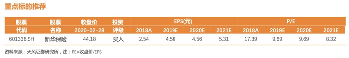 负债端方面,疫情对于1季度NBV的负面影响很大,但已得到充分预期与反应。本质上疫情仅冲击供给端,但提升需求端,整体影响一定是利好。目前保险股估值受保费端(疫情影响)、资产端(利率下行)的压制,估值极低,截至2月28日,平安、国寿、太保、新华的2020年PEV分别为1.01、0.81、0.66、0.62倍。待保费反转与逆周期政策全部落地,保险股具有较大的向上空间。综合各项因素分析,以一年时间为维度,我们首推新华保险A;长期推荐中国平安,建议关注中国太保H、友邦保险。