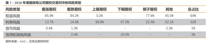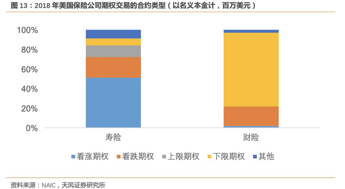 2)期权:2018年美国保险公司参与的期权交易的名义本金1.1万亿美元,其中寿险公司占比95%,财险公司占比5%。从具体种类来看,寿险公司主要的期权交易类型为看涨和看跌期权,名义本金占比分别为49%、20%,主要用于对冲权益风险;而财险公司最主要的期权交易类型为下限期权,占比75%,主要用于对冲利率风险和信用违约风险,其次为看跌期权(20%)。