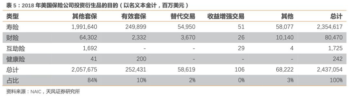 美国寿险公司应用金融衍生品的主要目的为套期保值对冲风险,财险公司套期保值的同时亦注重增厚收益。2018年美国保险公司运用于套期保值(广义套期保值)的衍生品名义本金为2.3万亿美元,占比94%。其中,寿险公司96%的衍生工具和健康险公司的全部衍生工具用于对冲风险;而财险公司有13%的衍生工具用于锁定预期收益、投资等其他目的,有5%的资金用于替代交易。