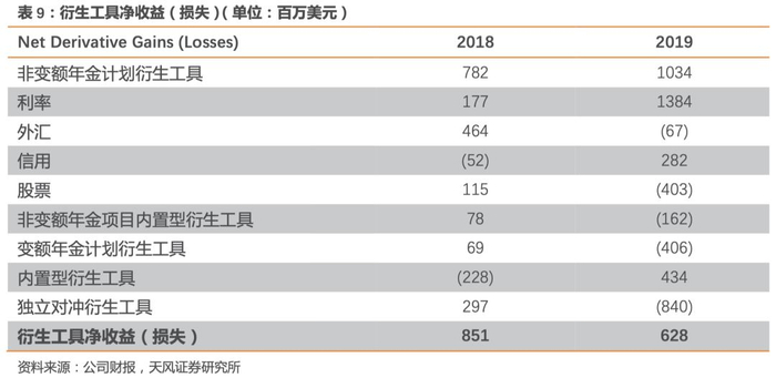 公司的大部分衍生工具未被指定或不属于会计准则下认可的对冲关系,比如用作宏观对冲公司各种风险敞口的衍生工具、用于构建投资组合的承保信用互换和利率互换等。对于这些不符合对冲会计条件的衍生工具,其公允价值的变化确认在利润表中的“Net Derivative Gains (Losses)”项目,而不能直接抵消被对冲项目的损益(即不体现在净投资收益项目)。从2019年的未被指定或不属于会计准则下认可的对冲工具使用情况来看,利率衍生品的使用带来13.84亿美元的收益,主要是由于美国长端利率在2019年下降对固定利率互换,期权和总收益率互换带来的有利影响。