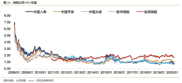 2)保险公司后续将加入国债期货交易,可通过套期保值策略来有效对冲未来固收资产的再投资风险。国际经验显示,美国寿险公司广泛运用了利率衍生品来进行利率风险管理,衍生品配置占可投资资产的1%,其固收类资产收益率相较利率更加平稳,且与10年期国债收益率基本保持了150-250bps的正向利差。目前保险股估值受保费端(疫情影响)、资产端(利率下行)的压制,估值极低,截至2月28日,平安、国寿、太保、新华的2020PEV分别为1.01、0.81、0.66、0.62倍。待保费反转与逆周期政策全部落地,保险股具有较大的向上空间。以一年时间为维度,我们首推新华保险,长期推荐中国太保、中国平安;建议关注中国太保H、友邦保险。