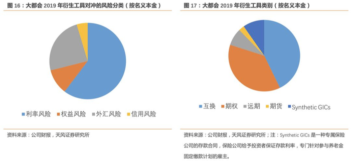 3)以大都会为例,其独立衍生工具配置占可投资资产比例为2%,其中用于对冲利率风险的衍生工具名义本金占比为61%。大都会充分运用互换、期权、期货等衍生工具,既有针对特定产品的风险对冲,亦有整体投资组合的风险对冲。大都会的对冲计划包括与保单保证利益有关的风险对冲、保单最低保证利率风险对冲、长久期负债合同中的再投资风险对冲、通用资产负债管理对冲策略等。