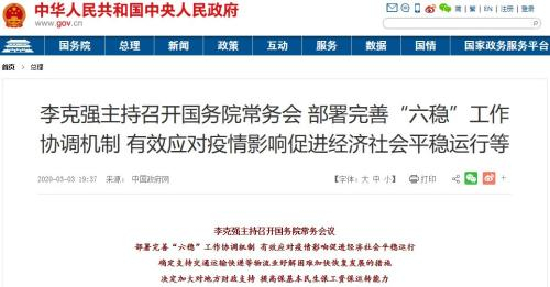 国务院总理李克强3月3日主持召开国务院常务会议,部署完善“六稳”工作协调机制,有效应对疫情影响促进经济社会平稳运行;确定支持交通运输、快递等物流业纾解困难加快恢复发展的措施;决定加大对地方财政支持,提高保基本民生保工资保运转能力。
