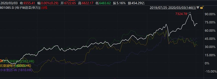 而这件事是不能用A/H价差一句话来解释的。把时间拉长一点看,2019年9月行情启动至春节前,上述的指数和港股这些公司基本是同步的,而疫情爆发后,魔幻的事情出现了,A股的消费电子基本完全无视产业链供需双重冲击,踩了油门往上冲。
