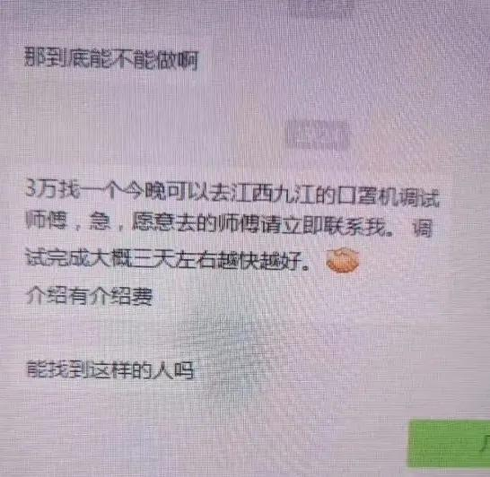 “3万元找一个今晚可以去江西九江的口罩机调试师傅,调试完成大概三天左右,越快越好。”不久前,一位采访对象的朋友圈里,发了这样一条求助信息。