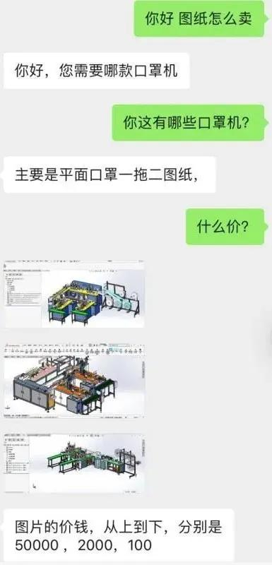 “一代、二代、三代平面一拖二口罩机的图纸价格分别是100元、2000元和50000元。”欧姆(化名)三天前从东莞一家口罩机设计公司拿到了几种机器的图纸,仅仅用了两天便卖了2套,赚了4000元。