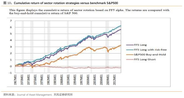 推荐原因:在本文中,我们使用Fama-French五因子模型的alpha值来研究经风险调整后的美国行业投资组合收益和行业轮动策略。我们发现五因素模型比三因素模型能更好地拟合美国行业投资组合的收益。在全样本期间,有50%的行业产生了显著的五因子alpha。我们通过应用简单的纯多头和多-空行业轮动策略来检验这些alpha是否可以显著地表示行业收益。我们的纯多头行业轮动策略买入具有正的五因子alpha的行业,夏普比率是买入-持有标普500策略(基准策略)的四倍。如果我们的策略能在衰退期间将持仓转向无风险资产,那么实现的夏普比率就是买入-持有策略的十倍,而多-空策略的表现不佳。