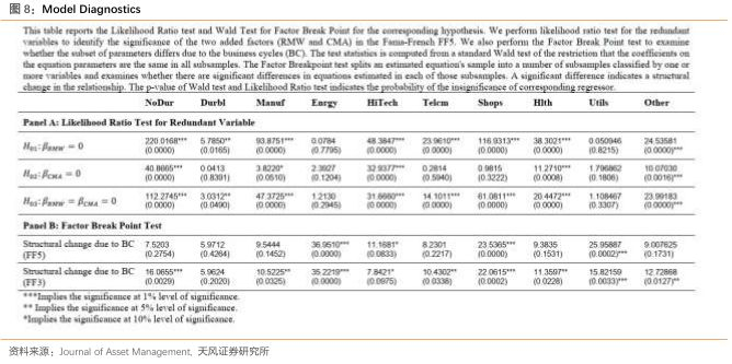 在比较三因子和五因子模型时,OLS估计表明FF5解释行业投资组合收益的能力优于FF3,产生了更高的调整后R方。两个新因子(RMW和CMA)的加入增加了统计显着性,并降低大多数行业的alpha估计值。冗余变量的似然比检验确定了盈利(RMW)和投资(CMA)Beta的显著性。此外,FF3和FF5会由于经济周期而出现结构性变化,这表明可以将经济周期考虑在内,以获得更准确的交易策略。我们基于1967年1月至2014年12月期间Fama-French美国行业投资组合的FF5滚动alphas的多头行业轮动策略所产生的收益率比标普500指数买入-持有策略(基准策略)高5.40%,而夏普比率是基准的近4倍。当我们考虑到经济周期时,策略的表现会更好。但是,我们观察到多空策略相对于基准策略并不成功。使用”S&P Select Sector SPDR ETF”(与Fama-French行业投资组合对行业的定义相匹配,是投资者的可行的选择)进行交易,能够在可接受的交易成本下证实我们上述的这些发现。我们的发现与Sorensen和Burke(1986)以及Stangl,Jacobsen和Visaltanachoti(2009)的发现是一致的。鉴于本研究发现了行业收益率的非正态特征,因此未来的研究可能涉及非线性模型。此外,利用五因子Fama-French模型将轮动策略扩展到其他类别的资产也将很有意义。
