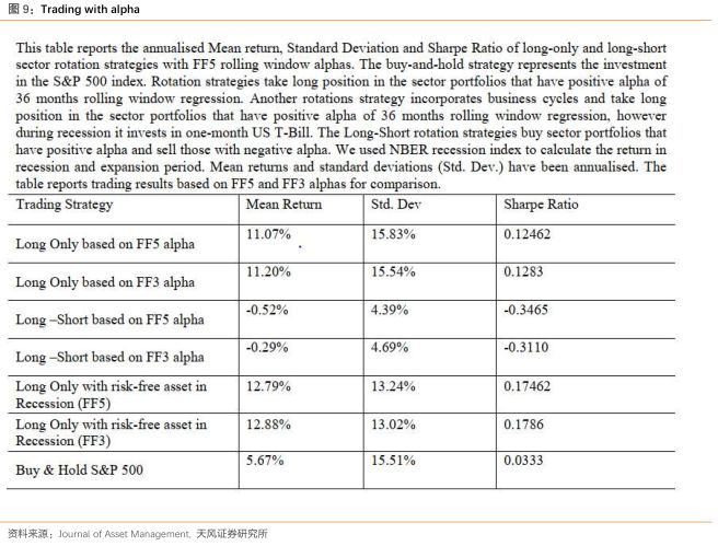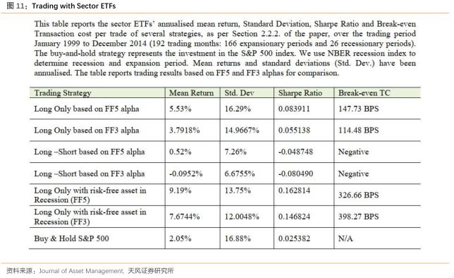 图11展示了策略的平均收益率,标准差和夏普比率。我们还给出了投资者可以支付的每笔交易的最大交易成本,以使该策略的夏普比率与基准策略的相同。该表的结果基于FF5和FF3 alpha。尽管基于FF5模型的策略的标准差略高,但它们的平均收益率和夏普比率也更高,并且能承担更高的交易成本。这表明,使用Sector Select ETF进行交易时,FF5模型更具优势。因此,接下来的分析将集中在基于FF5模型的结果上。将图11中的结果与图9中的结果进行比较,可以看出,与使用Fama-French行业投资组合进行交易相比,ETF的交易收益较低。这可能是由于交易时段不同。ETF交易期为1999年1月至2014年12月,共192个月(26个衰退期,166个扩张期)而Fama-French投资组合的交易期共576个月(83个衰退期,493个扩张期)。需注意的是,在这192个交易月中,标准普尔500指数的收益率为2.05%,而在576个交易期间中,收益率为5.67%。在图11中,基于FF5的多头轮动策略的夏普比率是基准策略的四倍,而考虑到经济周期后,多头轮动策略的夏普比率是基准的近十倍。多空策略仍然表现不佳。这可以得出有关投资的一些结论:多头策略中使用的正alpha更有可能预测到未来的正alpha,而负alpha不能很好地预测未来的负alpha,因为利用到负alpha的多空策略表现不佳。我们计算了每个策略的位于平衡点的交易费用,以评估策略对投资者的可行性。平衡点的交易成本以基点表示,是可以支付的每笔交易的最高成本,是使得策略的夏普比率等于基准策略的交易费用。平衡点的交易费用越高,说明我们的策略越可行。与Fama-French行业投资组合的轮动策略相似,我们发现多头策略提供的收益高于基准,而多空策略提供的收益较低。收益率最高的策略是考虑经济周期的多头策略(基于FF5模型,在扩张期购入相应行业的ETF中,在衰退期投资于国库券),比基准高出7%以上。该策略的平衡点交易费用表明投资者可以支付每笔交易高达326bps的交易费用,并且仍产生高于基准的夏普比率。基于FF5 alpha的纯多头行业轮动策略(不考虑经济周期)的平衡交易成本较低(每笔交易148个基点),但是考虑到ETF交易的交易成本相对较低(根据第2.2.3节估算为25个基点),该策略对投资者而言依然是高度可行的。本节说明,使用FF5模型alpha来对行业ETF进行简单的行业轮动,能够在可承担的交易成本下产生更高的夏普比率。4. 结论