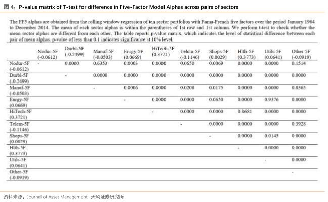 为了深入了解各行业的表现是如何随时间变化的,我们绘制了采样期内十个行业的滚动FF5 alpha的时间序列,如下图所示。卫生行业在60年代和70年代后期表现良好。1979年至1981年期间能源行业提供的Alpha值比其他任何部门都高,我们注意到,高科技领域的统治地位在1994年至2003年期间尤其显著,这与互联网的繁荣时期相吻合。我们还观察到,能源行业的负alpha值比其他部门的负alpha值更为突出。对于“其他”行业,FF5 alpha在大多数采样期间为负。我们为了进一步检验FF5 alpha在各个行业之间是否不同,进行了非配对t检验。表3列出了十个行业投资组合的滚动FF5 alpha值的非配对t检验结果,发现89%的FF5 alpha(45对中的40对)在至少10%的显著水平下彼此间显著不同。为了与FF5 Alpha进行比较,我们现在同时考虑FF3和Jensen的Alpha。每个投资组合和每个模型完成577个回归,总计17310(= 577x10x3)回归。表4列出了每个行业在三种模型(CAPM,FF3和FF5)下,统计学意义上显著与不显著的滚动alpha值的百分比。当我们从单因子(Jensen’s alpha)转换为FF5 alpha时,制造业,能源和高科技行业的Alpha值呈上升趋势。就制造业而言,CAPM模型下,显著的alpha值所占百分比为9.36%,但是当用FF5模型估计alpha时,显著的alpha值占的百分比增加为CAPM下的2倍,而该行业也是负的alpha值增加最多的行业(增加85%),我们在能源和高科技行业也发现了相似的规律。而与它们相反的是,在电信行业,显著的FF5 alpha所占百分比低于Jensen’s alpha,但高于FF3 alpha。这是因为电信行业在抽样期内无法获得很多(显著)正的alpha值,但是该行业中的alpha负值百分比却有所增加。这证实了下图中展示的电信行业的表现(欠佳),其中FF5 alpha的时间序列在大部分时间段均为负值。对于公用事业行业,显著的FF5alpha值所占百分比略低于FF3,尽管总的正(负)alpha的百分比高于(低于)FF3。
