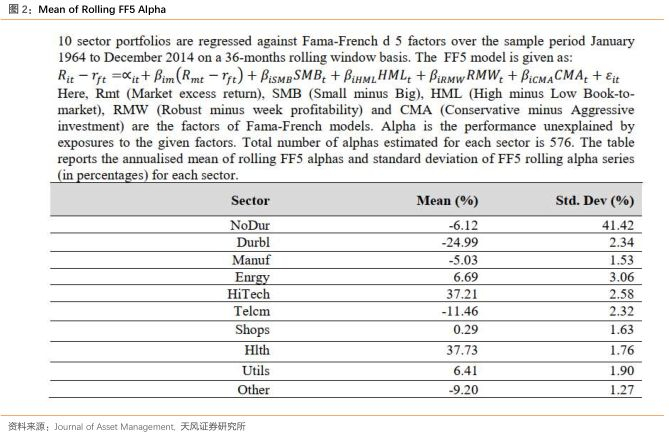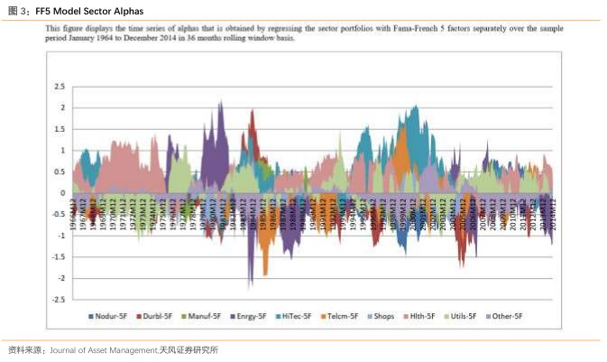图2列出滚动FF5 alpha的平均值及其标准差。每个行业的总Alpha数为576。平均Alpha值最高的是高科技和医疗保健行业,而最低的为耐用品行业(每年-24.99%)。在所的10个行业中,平均alpha值为正(每年3.15%)。Dellva,DeMaskey和Smith(2001)对35个富达行业基金的研究也得到了正的平均alpha。但是,他们的正Alpha值是35个行业基金的平均Alpha值,没有指出具有正alpha和负alpha的具体行业。Dou等(2014年)使用MSCI数据并发现在在牛市和熊市中,能源,高科技和卫生行业都具有正的alpha而耐用和制造业行业的alpha值都为负。我们在本文中的发现是相似的。