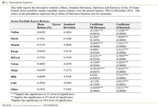 图1列出了样本期内十个Fama-French投资组合的描述性统计数据(平均超额收益,标准差,偏度和峰度)。