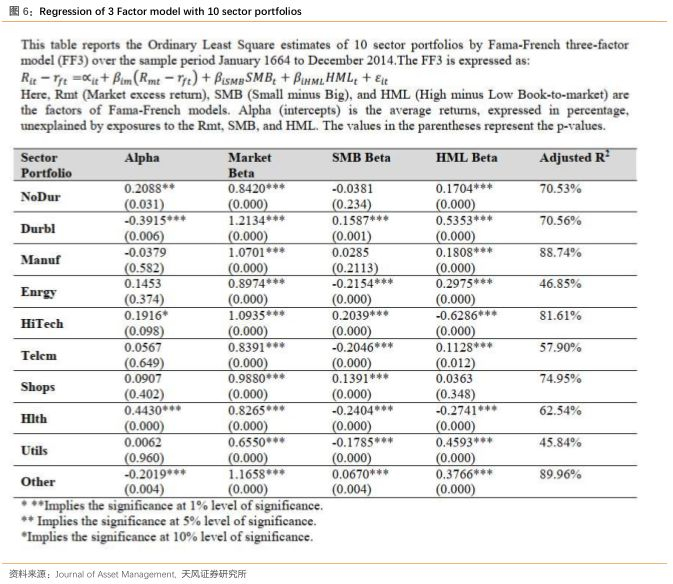 本文中,我们在新的五因子模型下研究了美国行业投资组合经风险调整后的收益表现。我们还进一步检验了美国行业投资组合的五因子alpha是否可以用于构建可行的行业轮动策略。行业ETF的存在使得投资者可以在合理的交易费用下构建可行的行业投资策略。本文的贡献在于2点,首先,在五因子模型下评价了美国行业的表现,第二点,填补了在行业投资领域,着力于动态市场策略——行业轮动的研究空白。作为一种动态策略,行业轮动是指投资者根据行业的未来展望将投资从一个行业转换到另一个行业。行业转换的信号指标有经济指标,技术指标和一些表现指标(例如alpha)。我们的研究基于以下的观点:如果一个行业的五因子alpha是一个真正的alpha,那么基于此alpha的行业投资策略应该产生更高的收益。本文旨在强调行业分析对于投资的重要性,同时,我们将FF3与FF5模型对美国行业收益率和行业轮动策略的适用性进行了比较。在研究中,我们使用了1964-2014年间美国的10个Fama-French行业投资组合,我们的发现表明FF5能比FF3更好地描述行业的收益。且包含更多信息并具有更高的调整后R方。在统计学上,FF5也是更好的拟合模型,另外两个因子(RMW和CMA)显著增加了模型的对数似然性。我们研究中的行业轮动策略在本质上与Sassetti和Tani(2006)的研究最为相似。我们遵循了他们研究中的发现,而他们的研究表明基于alpha的行业轮动策略提供了比基于其他指标的策略更加稳定的表现。但是需注意的是,Sassetti和Tani(2006)的alpha的估计是基于30天,60天和90天的时间间隔。在标准的投资组合表现的研究中,为了避免日度数据中的潜在噪声,alpha的估计基于月度数据并通常以至少36个月为时间窗口。因此,我们开发了纯多头和多头-空头的行业轮动策略,其中用于行业轮换的信号为FF5因子模型的alpha。如果时段t中某个行业的FF5 alpha为正(负),我们将在时段t + 1中买入(售出)该行业。我们的行业轮动策略在接下来使用Fama-French美国行业投资组合和与之匹配的标普 Select Sector SPDR ETF时都有说明。此外,我们在衰退期和扩张期之间进行区分,并制定额外的多头策略,如果经济处于衰退状态,该策略将购入无风险资产(美国1月期美国国库券)。我们基于FF5 alpha的纯多头轮动策略的平均回报率比标普500买入-持有基准策略高出5.40%,并产生约四倍的夏普比率。当我们将经济周期考虑在策略中,在扩张期做多FF5 alpha为正的相应行业,并在衰退期购入一个月的美国国库券,该策略可产生比买入-持有标普500基准策略高出7.12%的平均收益和近10倍的夏普比率。我们的多空策略表现不佳。本文的结构如下:第二部分介绍了数据和方法,第三部分介绍了研究的实证结果,第四部分总结了本文。2. 数据与方法