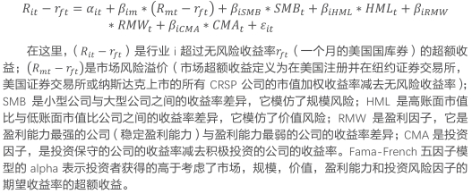 Fama和French(2015)将先前的三因子模型扩展到五因子模型,认为新的五因子模型可以更好地描述横截面上的收益率。他们在市场风险溢价,规模(SMB)和价值(HML)因子的基础上添加了两个新因子,即盈利能力(RMW)和投资(CMA)。