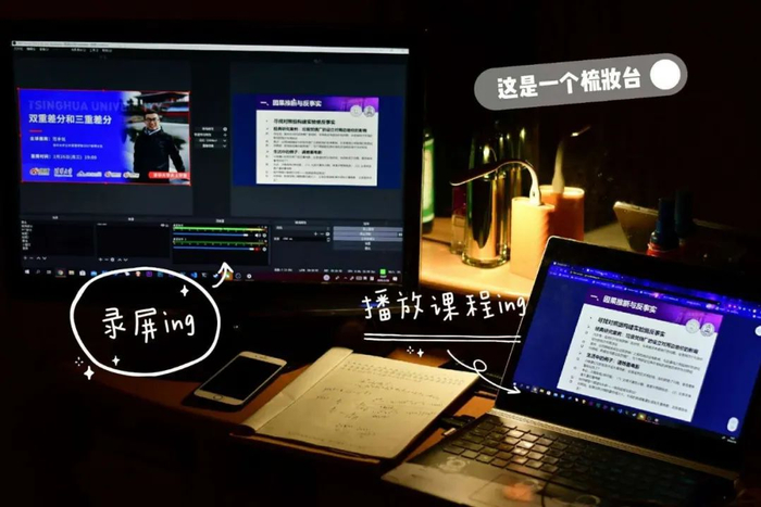 从二月初开始,清华联合微博平台进行了云上学堂系列课程的直播,于是我成为了一个需要使用两台电脑的直播民工(…)。家里的桌子空间有些不够,所以征用了梳妆台来摆放设备,假期也因这一活动变得忙碌且充实。
