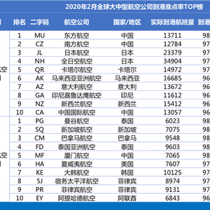 全球航司2月准点率排名:东方航空成准点冠军