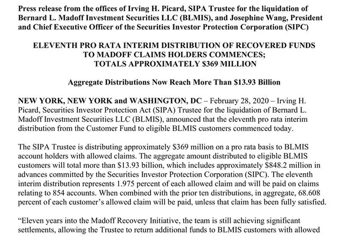 2020年2月28日,欧文·H·皮卡德作为麦道夫证券公司的受托清偿人,公布了最新的追索本金进展:他第十一次按比例向马多夫索赔持有人分配收回的资金约3.69亿美元。
