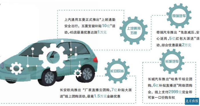 为获得更多客源,在车企开启线下“价格战”前,线上抢夺战早已打响。北京商报记者发现,车企线上直播时,几百元至上千元的优惠券、零首付零利率、部分车型送六年或12次免费保养等限时福利频频送出。