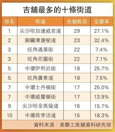 这项调查数据包含156条街道共7503间商铺,而铜锣湾空置率高达12.2%,为全港商区最高,该区域的1094家街铺中,有133家空置。四区空置率全线上升,主要以传统旅游区情况较为严重,旅游旺区尖沙咀,受零售市况转差以及内地游客减少拖累,空置率半年间急升4.1个百分至10.9%,升幅是各区之中最高。