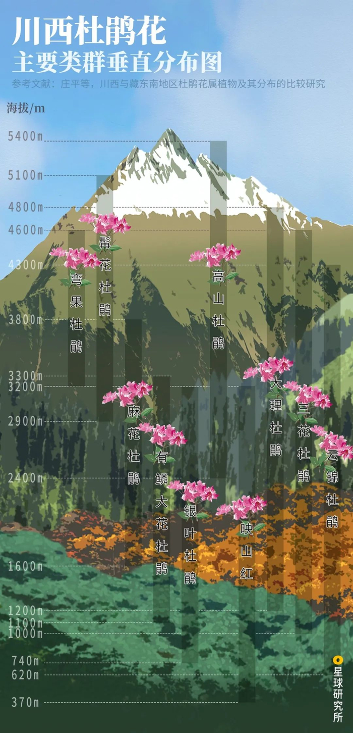杜鹃花属植物适应性强在中国这样的多山国家得以大展身手以杜鹃花物种多样性最丰富的中国西南部山地为例居然从海拔370米到5400米都是它的领地(川西杜鹃花主要类群垂直分布,制图@巩向杰&赵榜&陈睿婷/星球研究所)▼