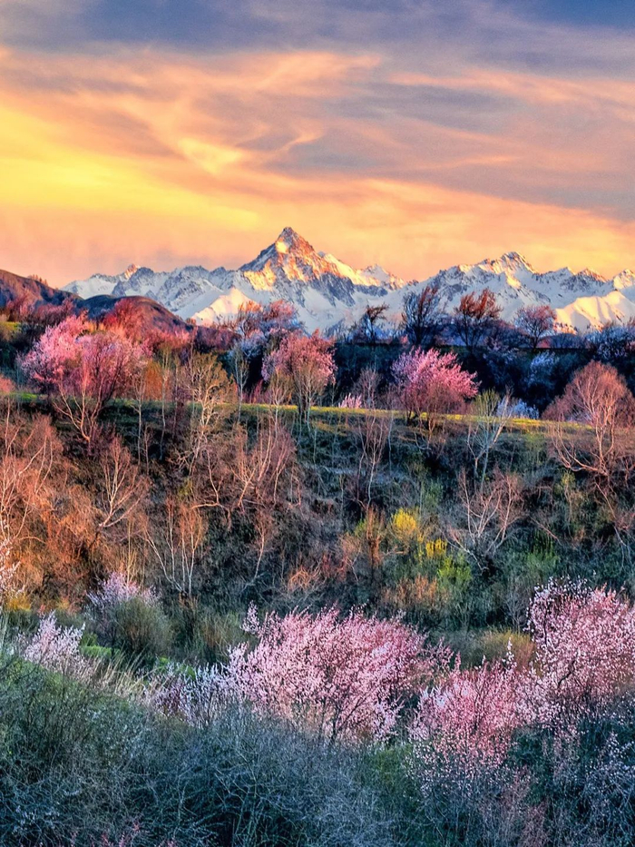 映照雪山(新疆新源县吉尔格郎谷地的野杏花、野山楂花,摄影师@赖宇宁)