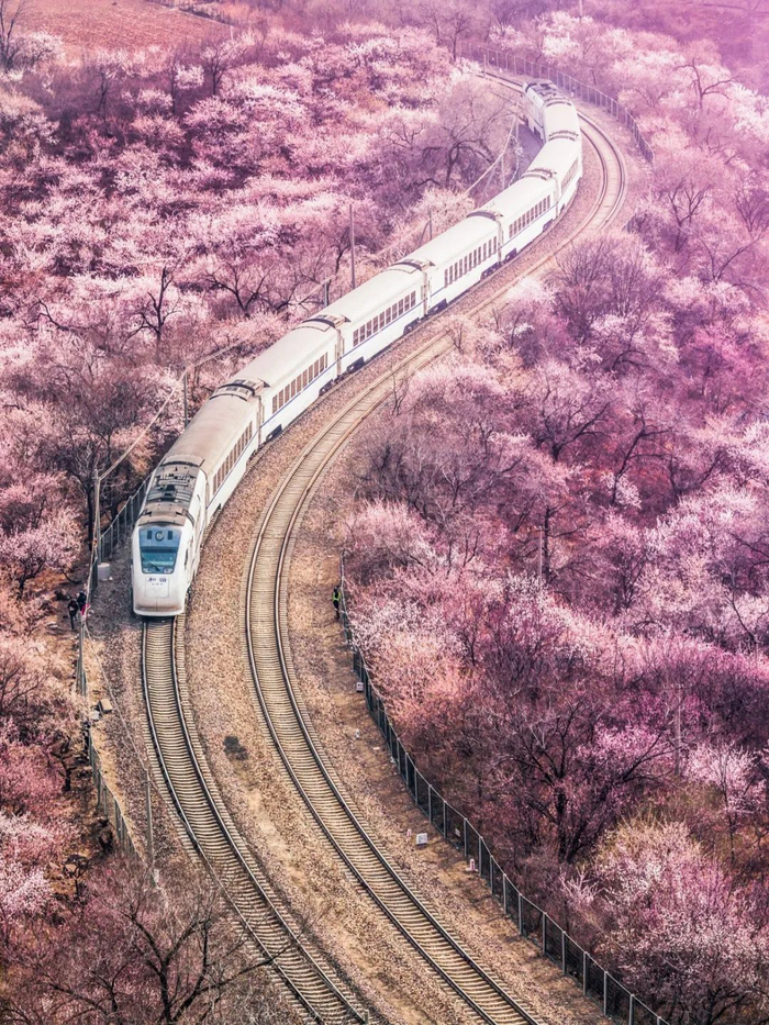 3月28日玉兰和连翘几乎同时进入始花期(长城的山桃花花海,拍摄于北京怀柔县九渡河镇撞道口村,摄影师@大张张;因为气候变暖等原因,近年北京的花期普遍提前,本文中的花期仅作参考)▼
