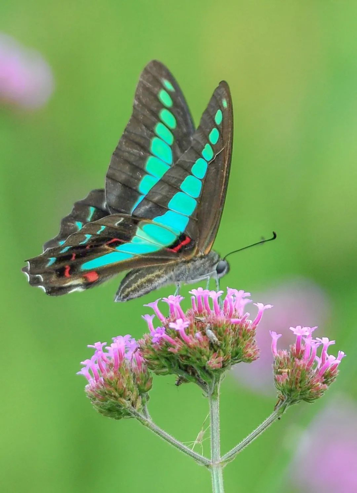 蝴蝶蝶变(青凤蝶,花是柳叶马鞭草,拍摄于杭州桐庐,摄影师@朱金华)▼