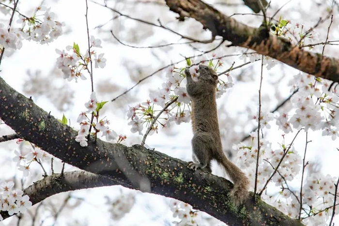 松鼠猛嗅“蔷薇”(杭州连横纪念馆的大叶早樱与松鼠,摄影师@杨照夫)▼