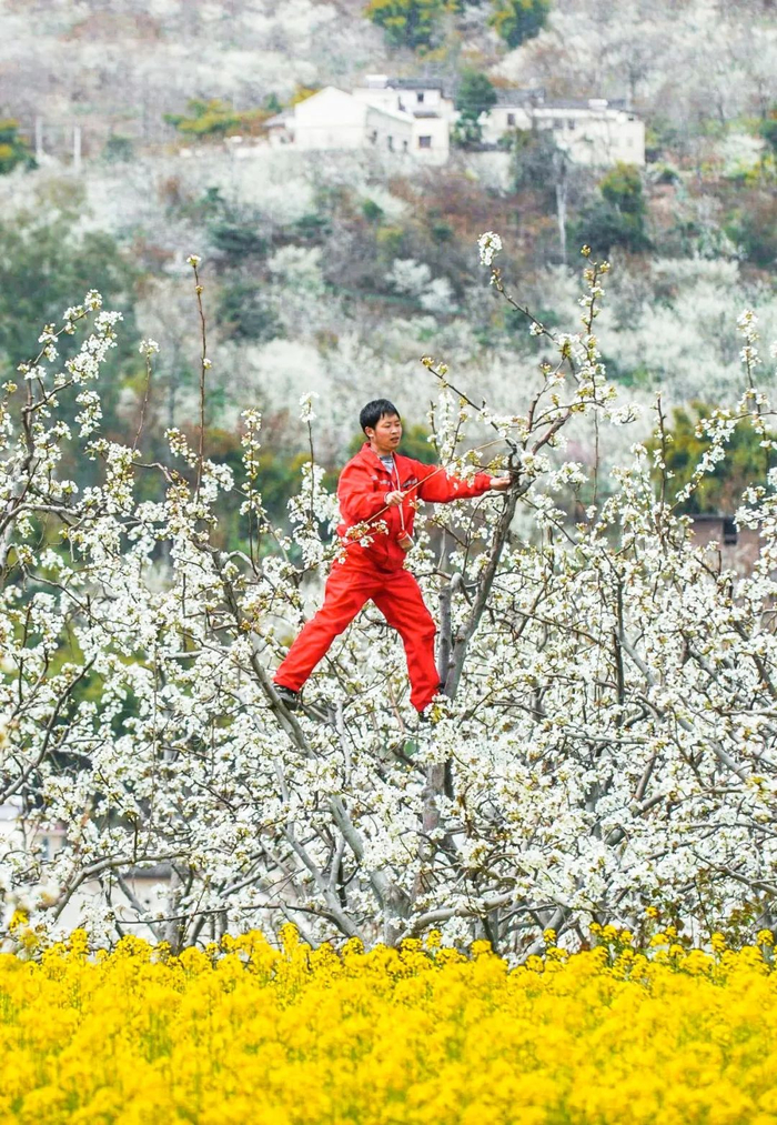 人类也抓紧时间生产耕作(四川雅安汉源县村民人工为梨花授粉,摄影师@杨涛)▼