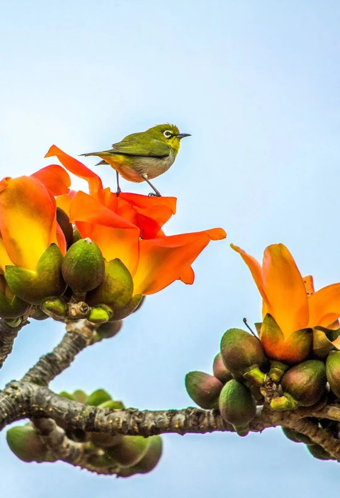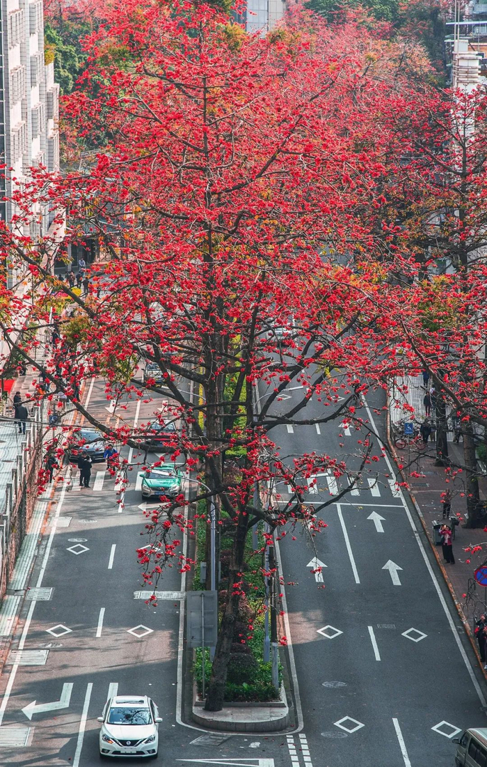在广州2月底的相对低温中木棉才刚把全身的叶片抖落往往10天之内就会在光秃秃的枝桠上重新绽放直径约10厘米的大花一树橙红、满目繁荣(广州的木棉,摄影师@何易成)▼