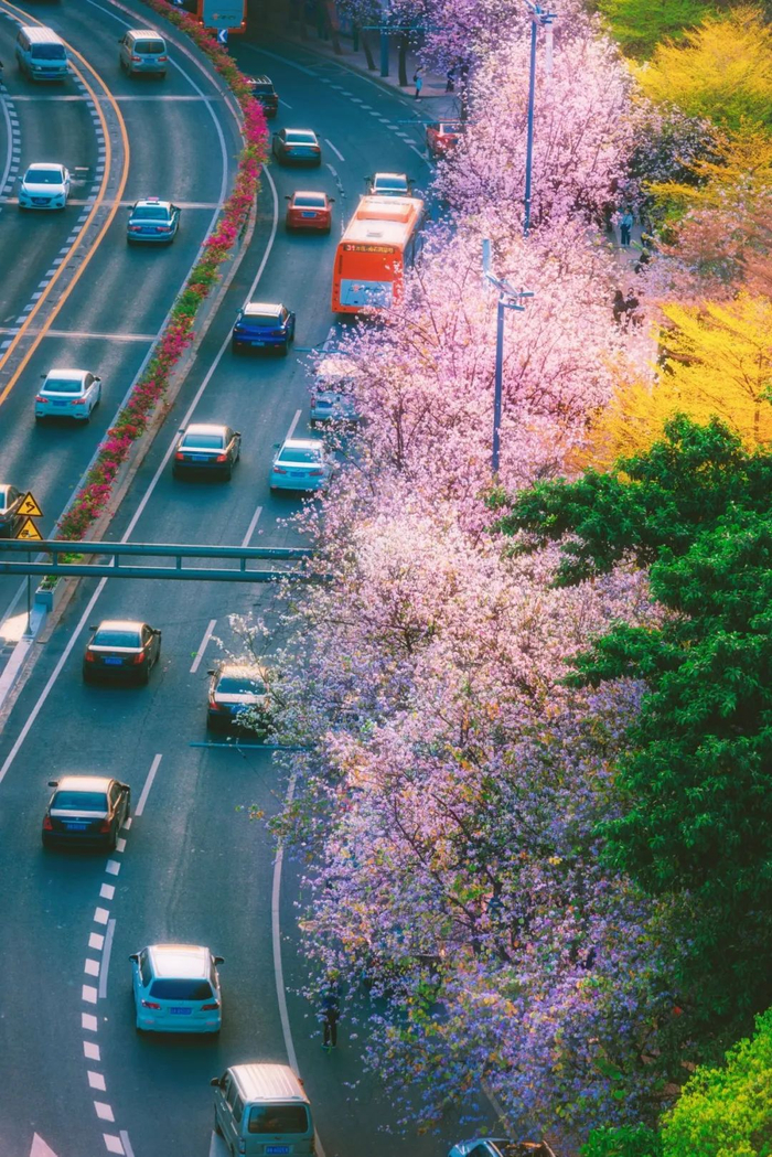 入春以后蒲桃、泡桐、麻栎木棉、桃树、朴树柚、荔枝、垂柳、楝树相继绽放花朵将广州装点为“花城”(广州的街道,洋紫荆,摄影师@静言)▼