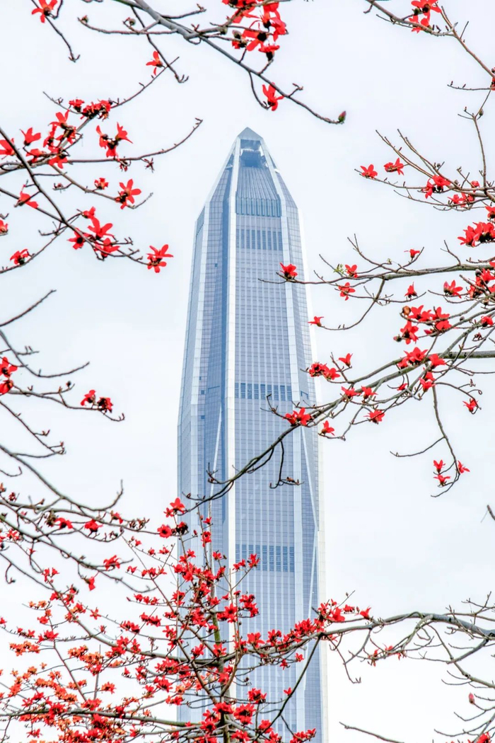 不过因为这里四季常青、鲜花不断春回大地所形成的反差并没有那么大(木棉花掩映下的深圳平安中心,摄影师@邓飞)▼
