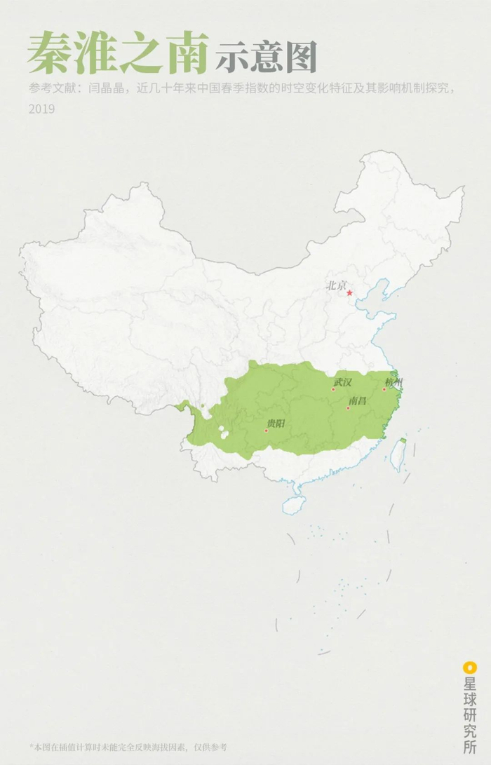 冬去春来、夏隐秋至这里是中国的四季分明地带春天的物候指征更加显著(秦淮之南,制图@巩向杰&赵榜/星球研究所)▼