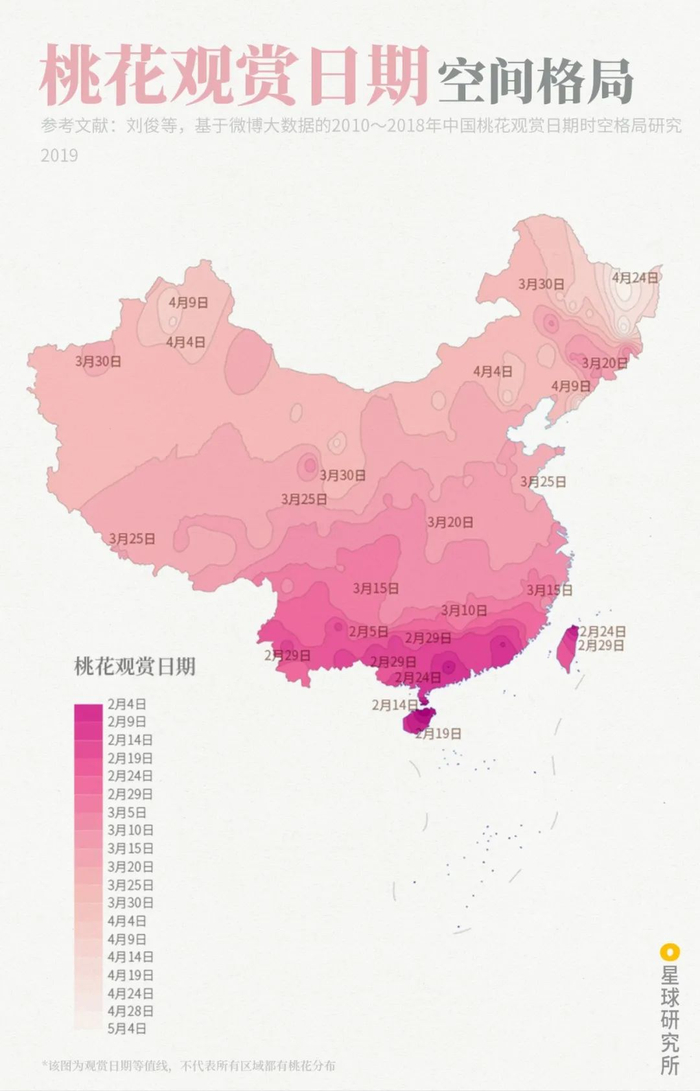 人们将桃花代指美好事物桃花盛开则“人面桃花相映红”桃花零落则“红消香断有谁怜”(桃花观赏日期空间格局,制图@巩向杰&赵榜/星球研究所)▼