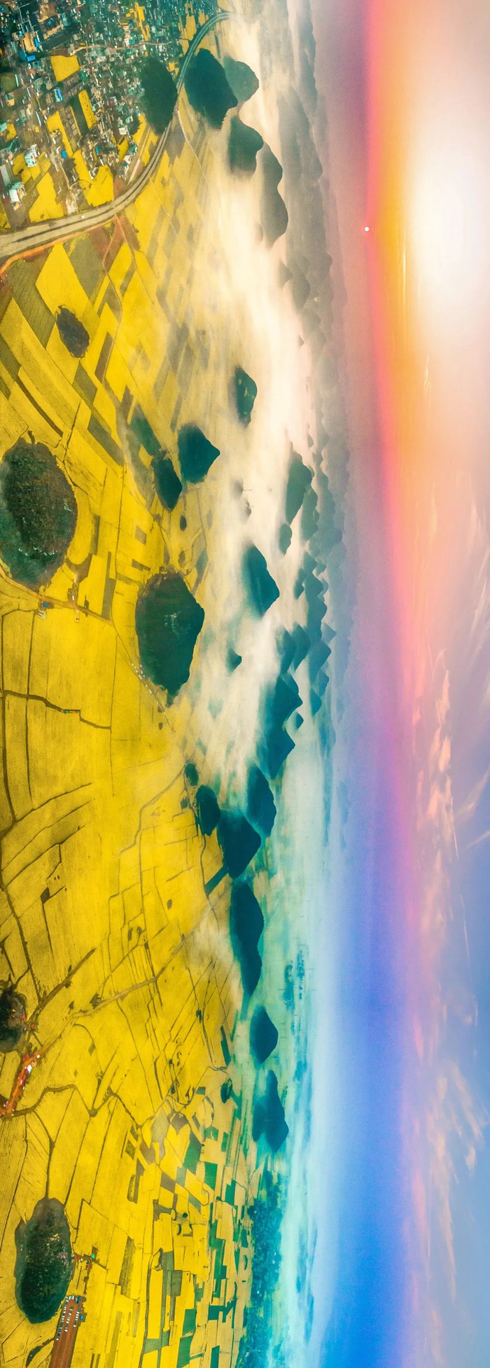 喀斯特峰林峰丛被油菜花田环绕如同花海中的岛屿(请横屏观看,云南罗平的油菜花,摄影师@祝云川)▼
