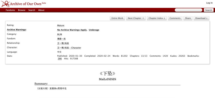 谁能料到,正是一篇“博君一肖”同人文,引爆了肖战粉丝内部的一场争斗,并最终波及了整个亚文化圈层。2月24日,用户@迪迪出逃记 在微博写到,她在AO3和LOFTER(AO3全称为Archieve of our own,是世界上最大的同人小说数据库之一,LOFTER则由网易出品,是中国最大的同人创作社区)发布了同人文《下坠》的最新连载。在这个故事中,肖战被设定为患有性别认知障碍的发廊女,王一博是与之恋爱的高中生。