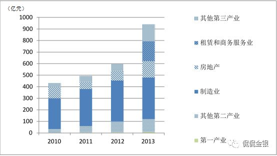 (2)行业多元化。在目标产业中大力投放信贷资源,在非目标产业中主动收缩信贷资源。2011年,退出、压缩授信客户285户,退出、压缩贷款44亿元,58%新增贷款投向制造业和批发零售业。2013年,限制对制造业的信贷投放,扩大对第三产业(特别是租赁和商务服务业)的信贷投放。