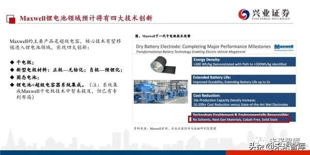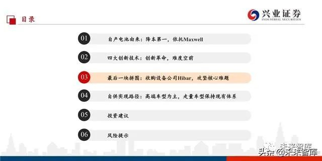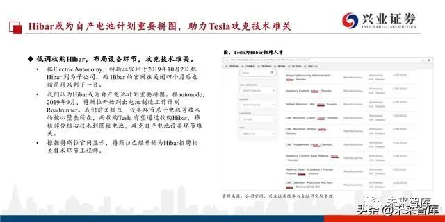 加拿大设备公司Hibar是特斯拉自制电池的最后一块拼图。2019年10月Tesla收购加拿大圆柱电池设备供应商Hibar,完成 自制电池的最后一块拼图。Maxwell具备突出的技术能力,但能否实现商业化量产,设备的可靠性是关键创新和壁垒所 在,Hibar将为Maxwell定制生产电池制造设备,帮助Maxwell超级电容中的领先技术工艺成功实现在锂电池领域应用。