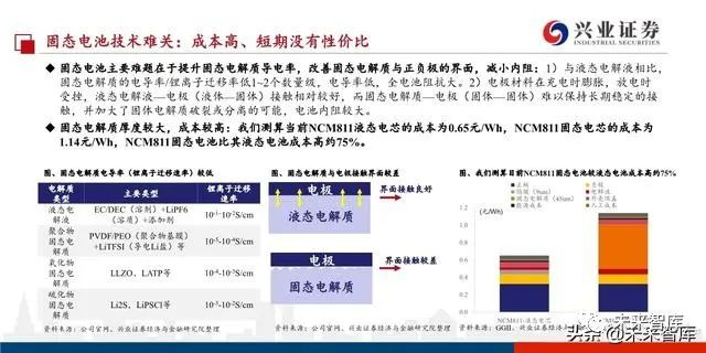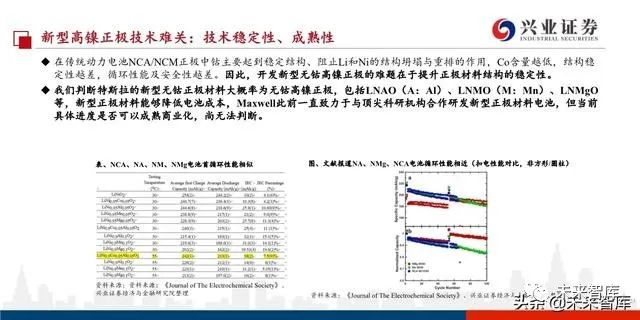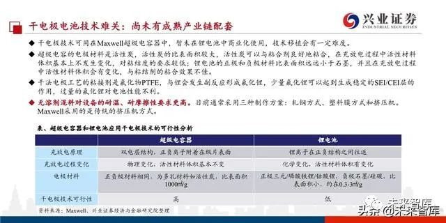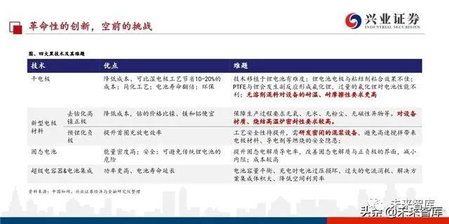 我们判断Tesla自制电池有四大创新:“干电极技术+新型电极材料(高镍无钴正极+预锂化负极)+固态电池+锂电池&超级电容器系统集 成”,不过四大创新均存在不小难度。产业化较快的可能为前两者,其中干电极技术可降低成本10-20%,提升能量密度至300Wh/kg+,延 长电池寿命。但难点在于对设备的耐温、耐摩擦性要求更高。新型正极钴降低,电池成本降低,难点在于提升正极材料结构的稳定性。负极预锂化可提升首圈充放电能量效率,难点在于生产安全性。