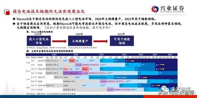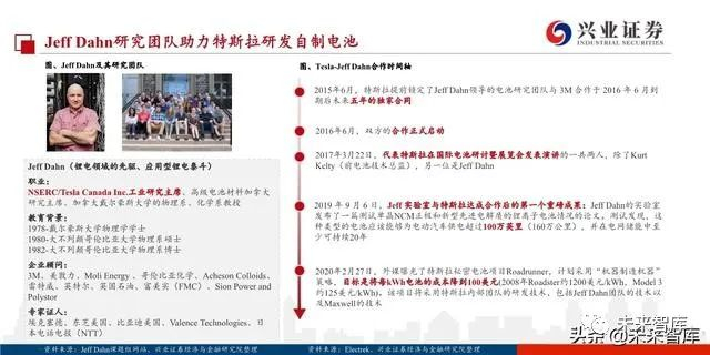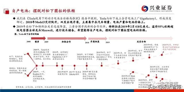 Maxwell是特斯拉自制电池的载体,自制电池意在摆脱随松下的依赖。松下曾独家供应特斯拉圆柱形电池逾十载,但从 2018年开始二者就汽车销量、电池产能和电池价格等问题产生较大分歧。特斯拉2019年4月收购Maxwell,同时与“三元 正极之父”Jeff Dahn的科学团队合作走上了自制电池的道路。