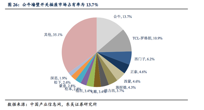 墙壁开关插座市场,因为里面有插座这两个字,公牛做得还不错,市场占有率13.7%左右(2017年数据)。