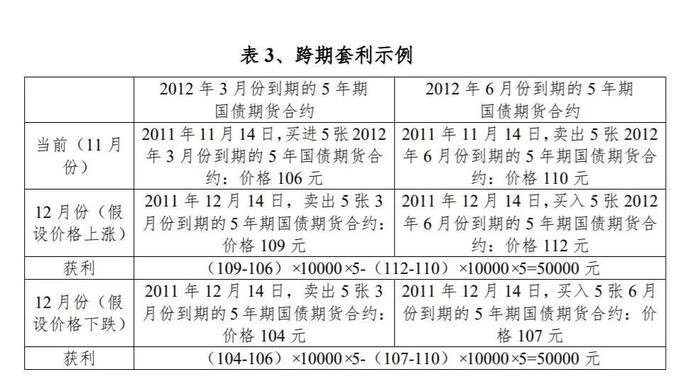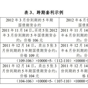 例如,2011年11月份,某投资者发现,2012年3月份到期的5年期国债期货价格为106元,2012年6月份到期的5年期国债期货价格为110元,两者价差为4元,投资者若预测一个月后的3月份到期的5年期国债期货合约涨幅会超过6月份的5年期国债期货合约,或者前者的跌幅小于后者,假设一张期货合约面值100万元,那么他可以进行跨期套利,具体操作策略参见表3。