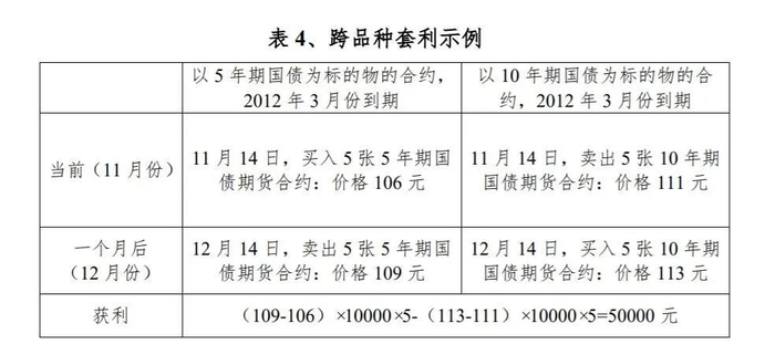 一般来说,跨品种套利是在同一交易所、相同到期月份、但合约标的债券不同的国债期货合约之间进行的。这两种品种间的关联度强,价格影响因素大致相同,在正常情况下价差比较稳定。例如2011年11月份某交易者发现2012年3月份到期的10年期国债期货价格为111元,而同样是2012年3月到期的5年期国债期货价格则为106元。他认为此价差高于正常价差,一个月后此价差会回落,于是该交易者在市场上卖出5张10年期国债期货合约,买进5张5年期国债期货合约,具体参见表4(假设每张合约面值100万元):