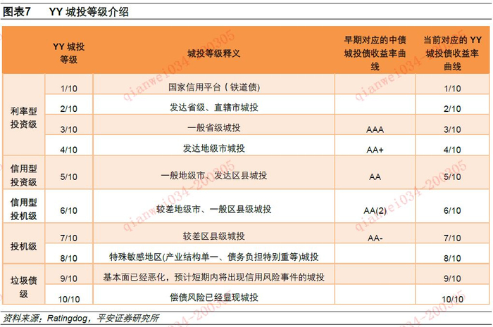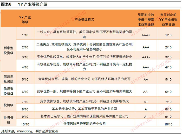 YY等级的基本逻辑是将信用债分成产业和城投两类,再根据基本面打分进行分档。YY将信用债券分为城投债与产业债,分别进行评级。城投债评级首先要考量城投债发行主体所在区域的经济财政债务等因素,其次是考量该城投平台在当地的地位,从事业务的优先级别等个体因素,最后考虑城投平台所对应的行政级别。产业债券的评级主要考虑的发行主体所在的行业发展前景、自身的竞争优势、公司治理与管理情况,财务稳健程度,最终落实到对其偿债能力与偿债意愿的评估,从而确定其评级分档。根据上述逻辑,YY分别将城投和产业的信用资质分为10个档位。